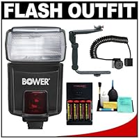 Kit includes: ♦ 1) Bower SFD926N Digital Autofocus Power Zoom Flash ♦ 2) Precision Design FB350 Flip Style Flash Bracket ♦ 3) Precision Design i-TTL Off-Camera Flash Cord ♦ 4) Precision Design 4 NiMH Batteries with Rapid Charger ♦ 5) Precision Design Deluxe 6 Piece Lens & Digital SLR Cleaning KitThe Bower SFD926N Digital Autofocus Power Zoom Flash is an innovatively designed flash unit for both digital and traditional SLR cameras with a wide array of high-end features at an affordable price. This model -- compatible with Canon SLR cameras -- features fully automatic i-TTL operation and helps photographers fill shadows, add depth, avoid red-eye and improve image resolution.